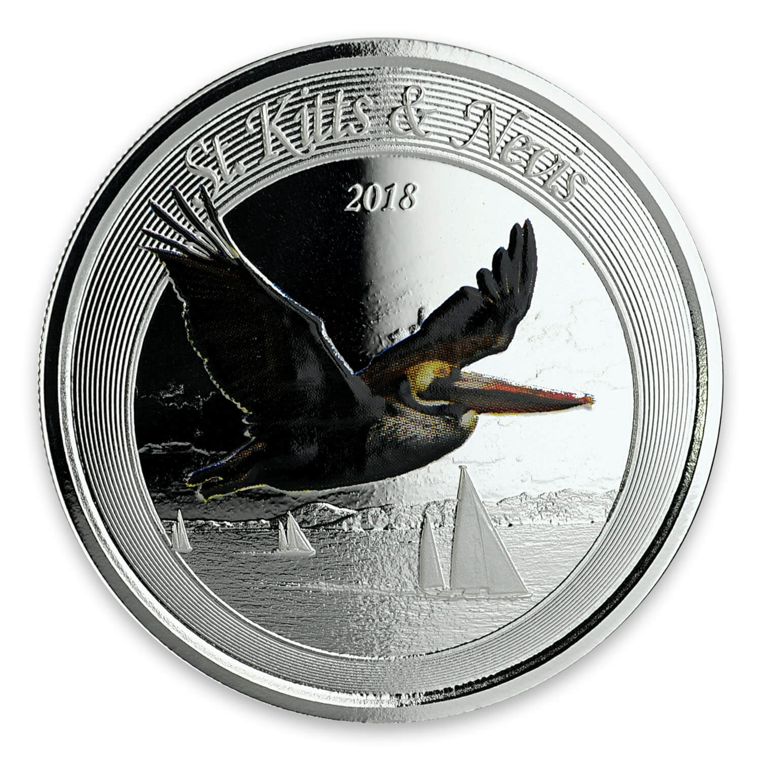 Опис: Національний птах Сент-Кітс і Невіс, коричневий пелікан (на островах його ласкаво називають «бубі»), в польоті на передньому плані, а на задньому плані — вітрильники на тлі островів.