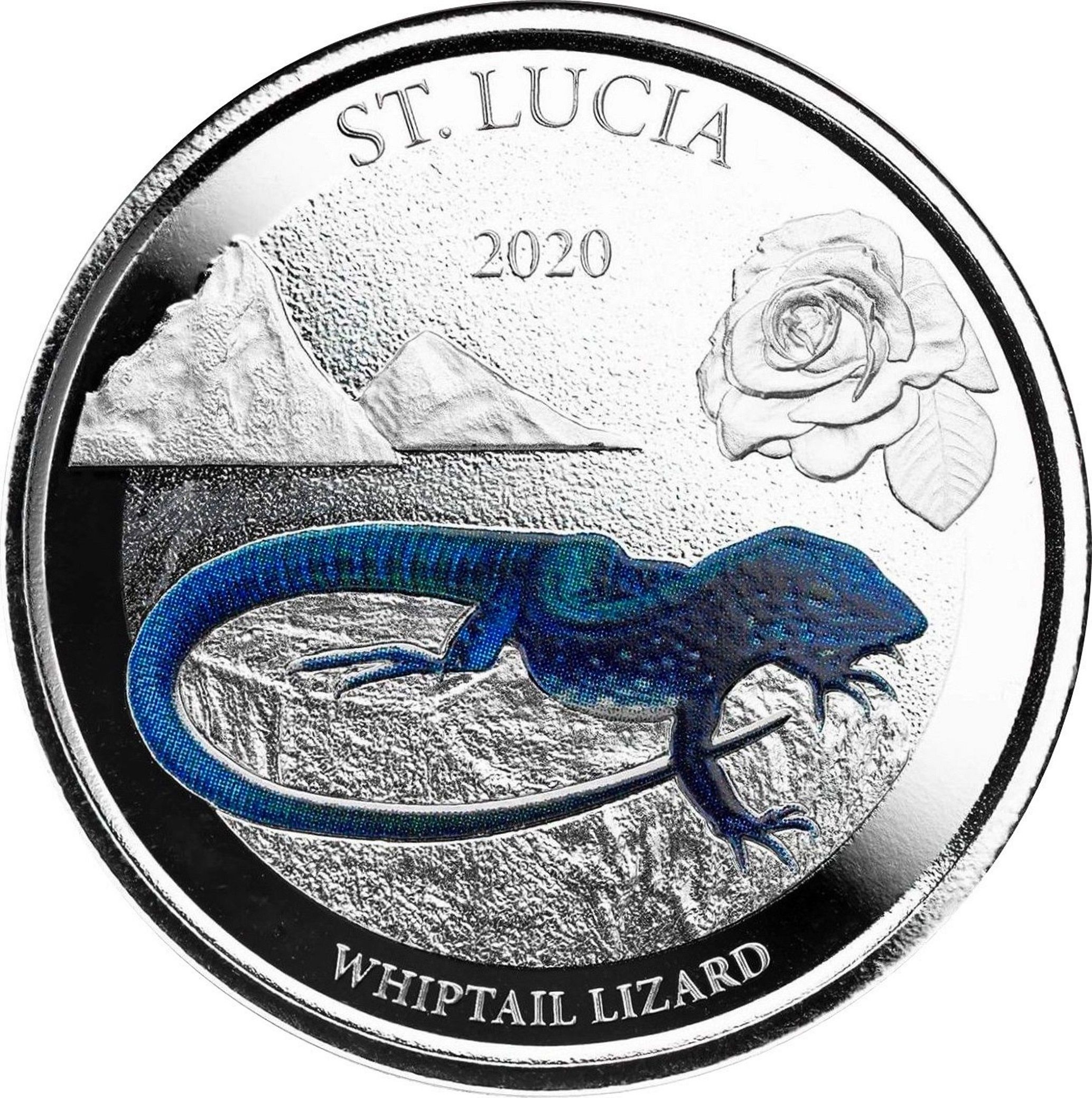 Опис: Ящірка Whiptail (кольорова) на скелі з вулканічними вершинами Gros Piton і Petit Piton ліворуч та національною квіткою, трояндою Сент-Люсії, праворуч.