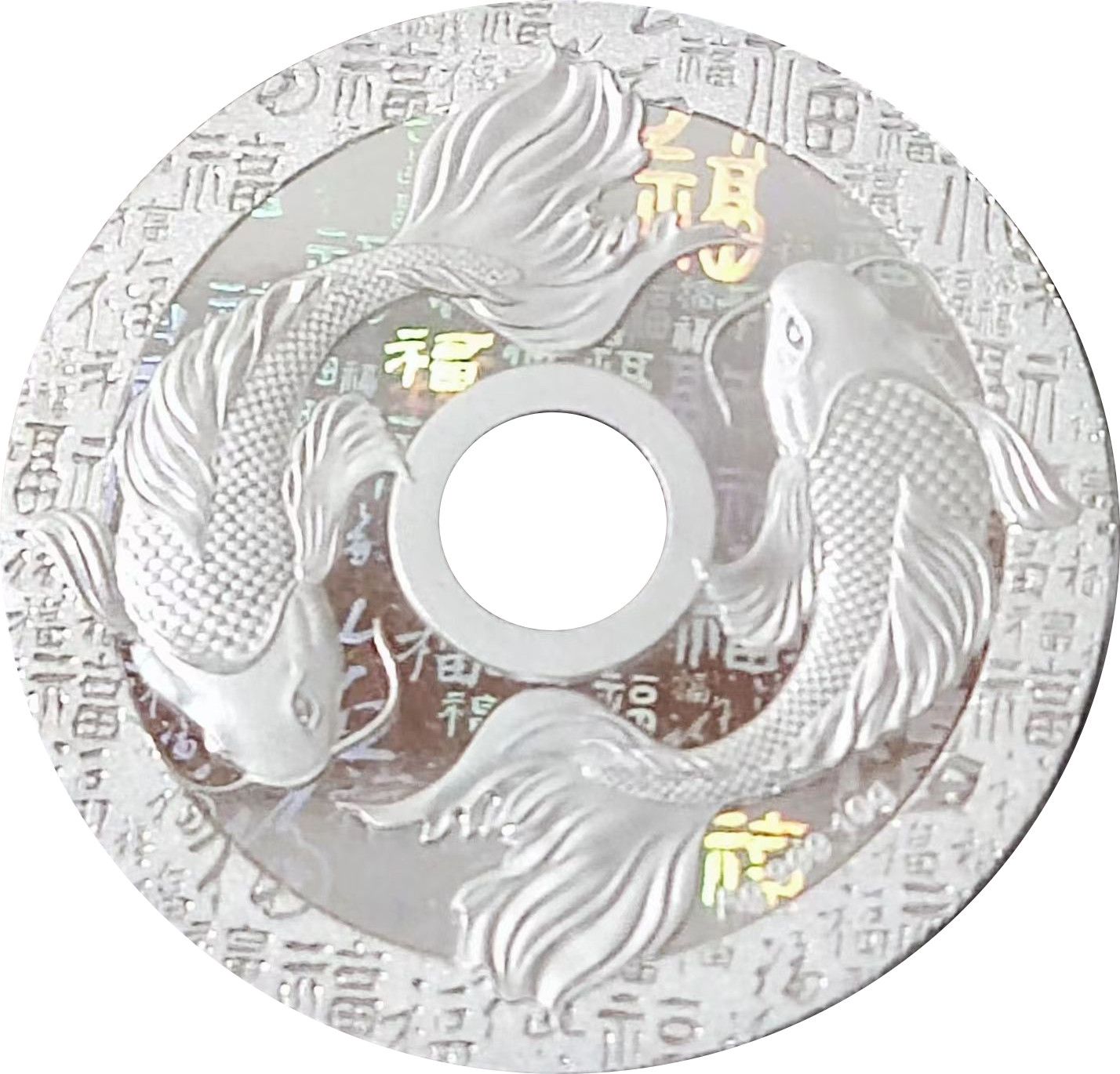 Опис: Дві риби-карпи, китайський символ щастя, одна над центральним круглим отвором, друга під ним, китайський ієрогліф «福» з безліччю написів на тлі.