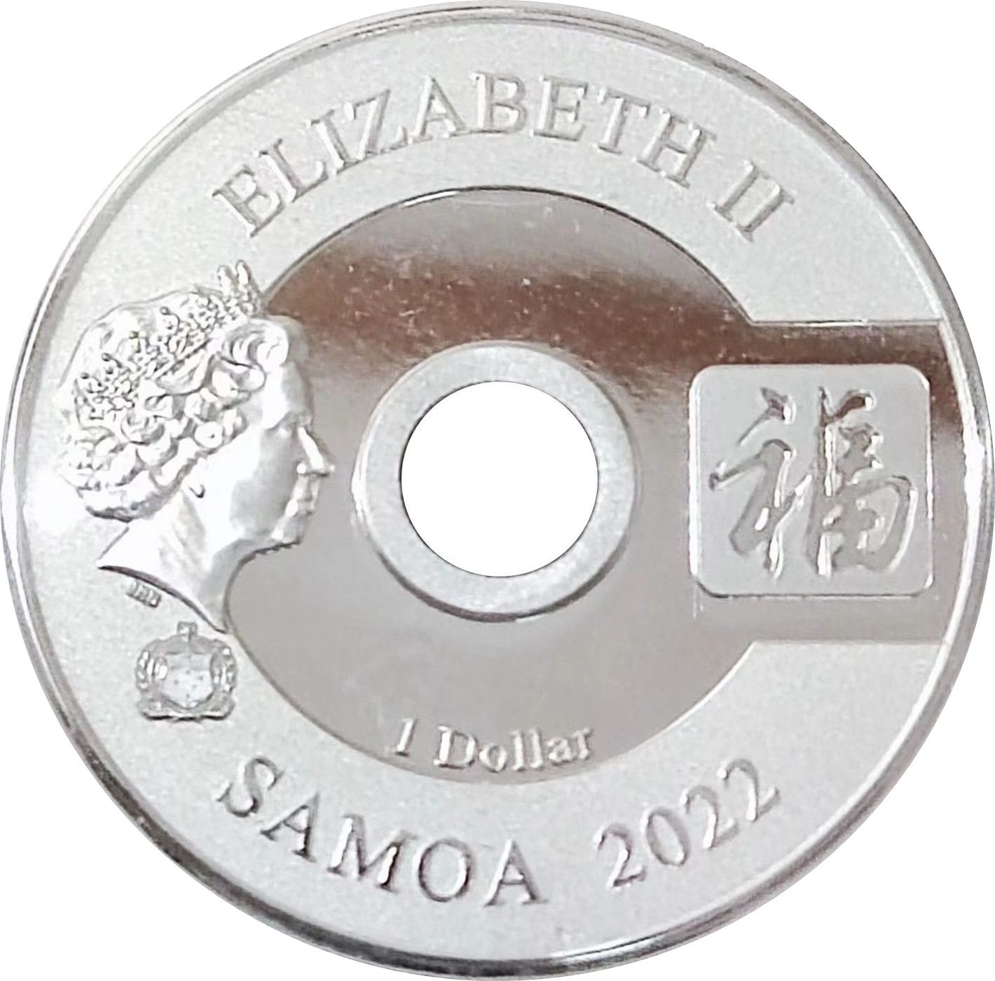 Опис: 4-й портрет королеви Єлизавети II з маленьким гербом Самоа внизу ліворуч від центрального круглого отвору та китайським ієрогліфом «福» праворуч.