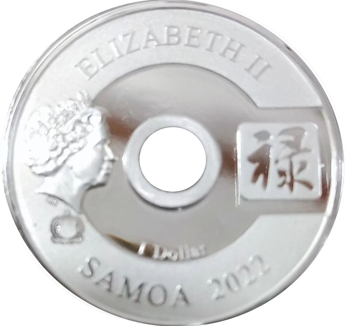 Опис: 4-й портрет королеви Єлизавети II з маленьким гербом Самоа внизу ліворуч від центрального круглого отвору та китайським ієрогліфом «禄» праворуч.