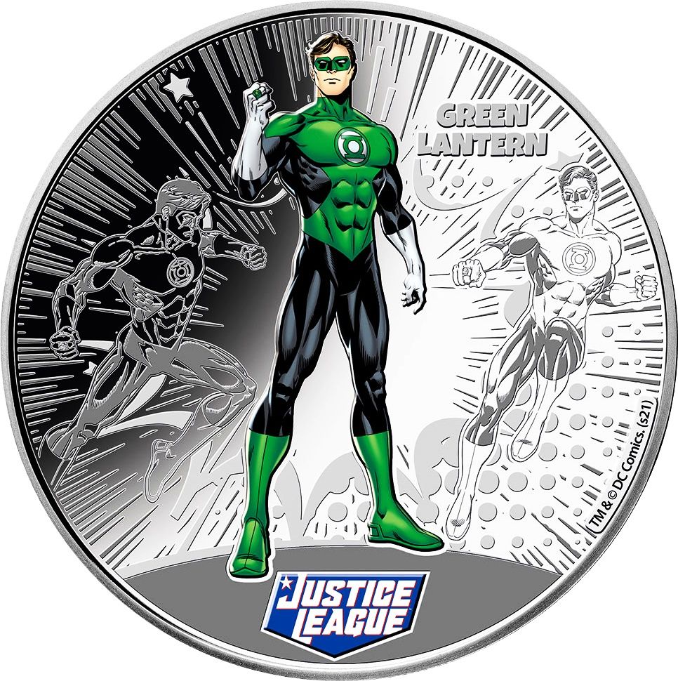 Опис: Зелений Ліхтар у повному кольорі з двома додатковими графічними зображеннями Зеленого Ліхтаря по обидва боки на тлі, логотип Ліги Справедливості у кольорі внизу.