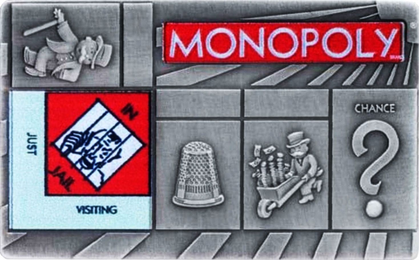 Опис: Нижня ліва чверть ігрового поля «Монополії» з кольоровим полем «У в'язниці» та іншими меншими полями і кольоровим логотипом «Монополії».