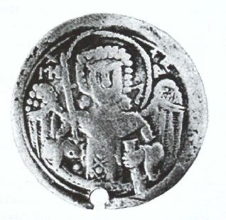 Опис: Король в імператорському вбранні отримує благословення від Ісуса або Ісус накладає корону на його голову і тримає в лівій руці глобус-хрест, Христос тримає Євангеліє в лівій руці.