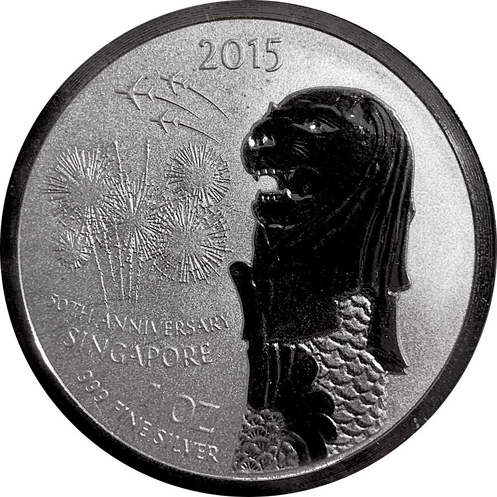 Опис: На аверсі зображено скульптуру Мерліона Сінгапуру, міфічну істоту з головою лева і тілом риби, яка є талісманом і національним символом Сінгапуру. Поруч із Мерліоном зображені феєрверки та три винищувачі, що летять у небі, які символізують святкування річниці.
