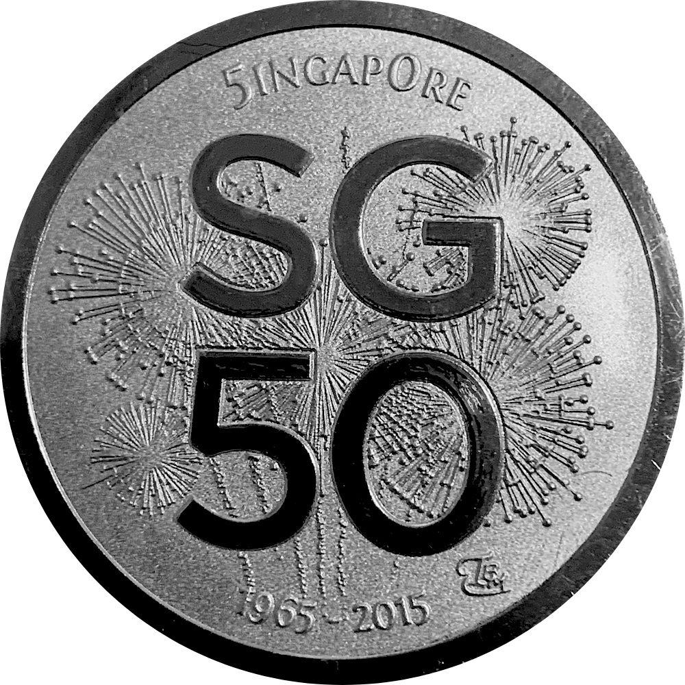 Опис: На звороті в центрі зображено логотип SG50, а на тлі — феєрверки. Назва країни-емітента розміщена зверху і стилізована цифрами 5 і 0, що читаються як (5)INGA (0)RE. Рік ювілею вказано знизу, а праворуч — знак монетного двору.