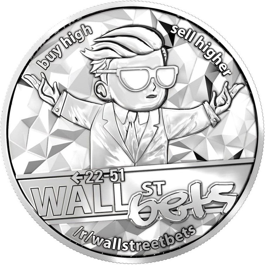 На аверсі срібної монети Wall Street Bets вагою 1 унція зображено мультяшного персонажа, представленого в логотипі субреддіту WallStreetBets. Фігура зображена в костюмі, з зачесаним назад волоссям і в сонцезахисних окулярах. У логотипі та дизайні на аверсі зображено дорожній знак з Уолл-стріт у Нью-Йорку з написом «bets», нанесеним фарбою з балончика.