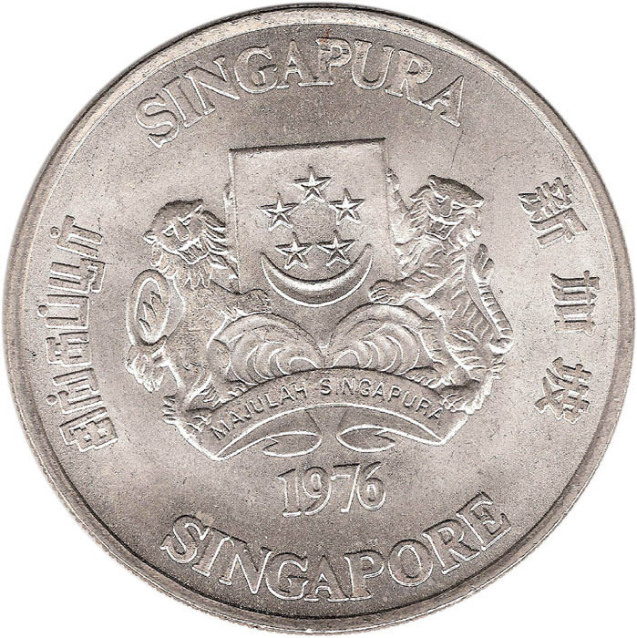 Опис: Герб Сінгапуру з підтримами в центрі, оточений словом «SINGAPORE» чотирма офіційними мовами. Дата під гербом.
