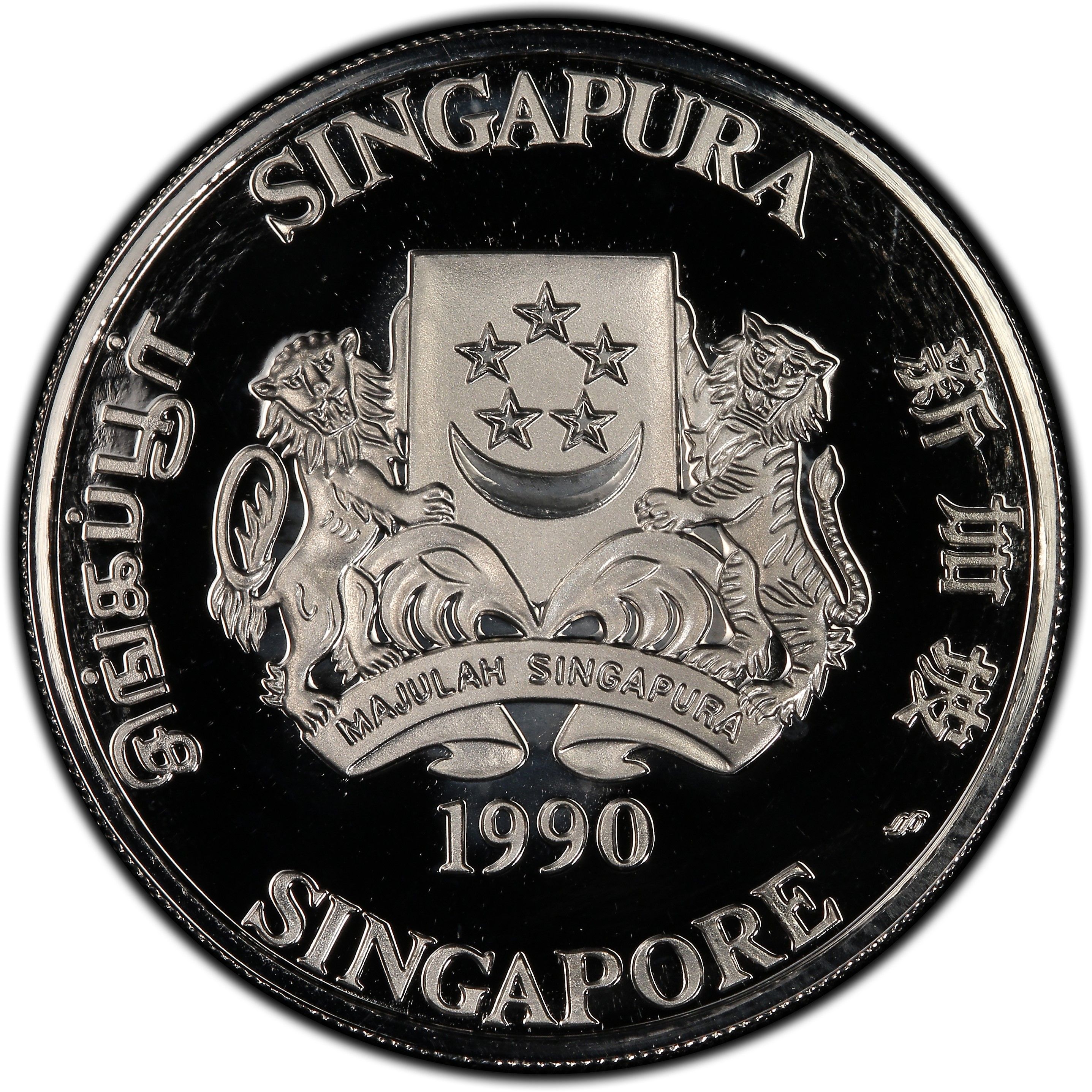 Опис: Емблема з датою під нею та написом «Сінгапур» з чотирьох боків англійською, тамільською, китайською та малайською мовами.
