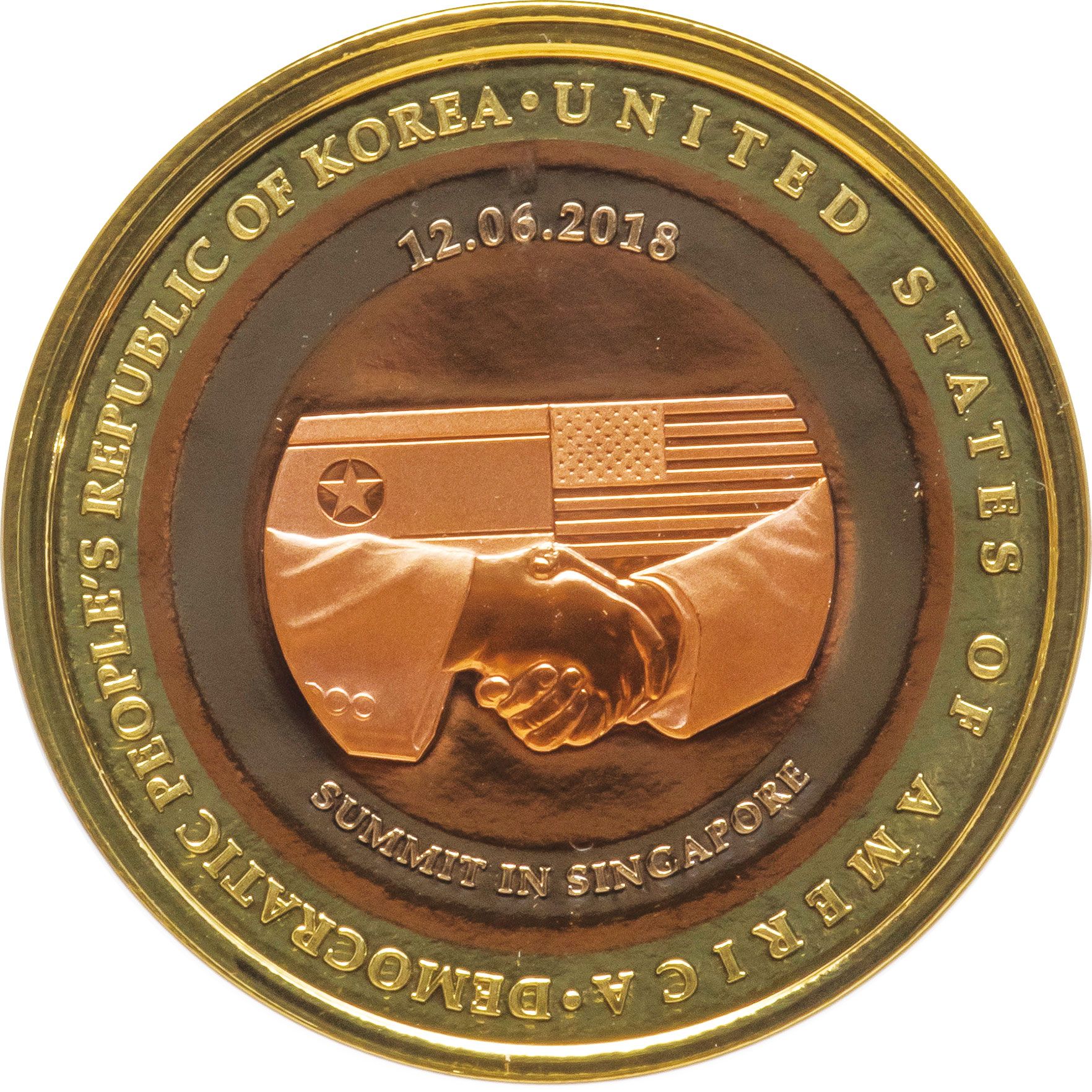 Опис: На аверсі медальйона зображено рукостискання двох лідерів та національні прапори обох країн. Державний прапор Північної Кореї зображений ліворуч, а державний прапор Сполучених Штатів — праворуч, що влучно відображає позицію обох країн на політичному спектрі. Важлива дата саміту, 12.06.18, та напис «Саміт у Сінгапурі» також викарбувані на аверсі медальйона.