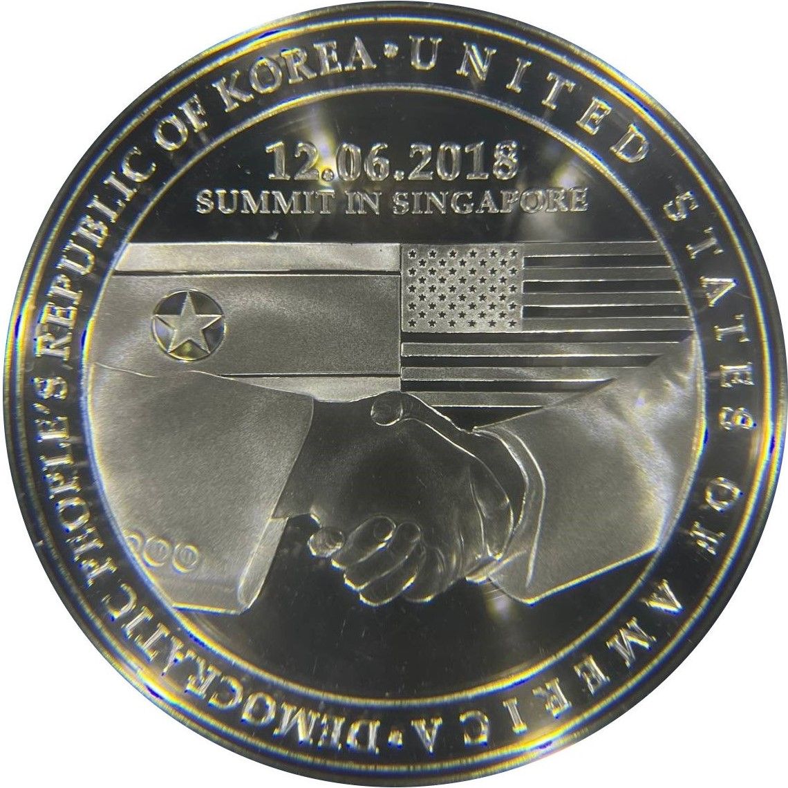 Опис: На аверсі медальйона зображено рукостискання двох лідерів та національні прапори обох країн. Державний прапор Північної Кореї зображений ліворуч, а державний прапор Сполучених Штатів — праворуч, що влучно відображає позицію обох країн на політичному спектрі. Важлива дата саміту, 12.06.18, та текст «Саміт у Сінгапурі» також викарбувані на аверсі медальйона.