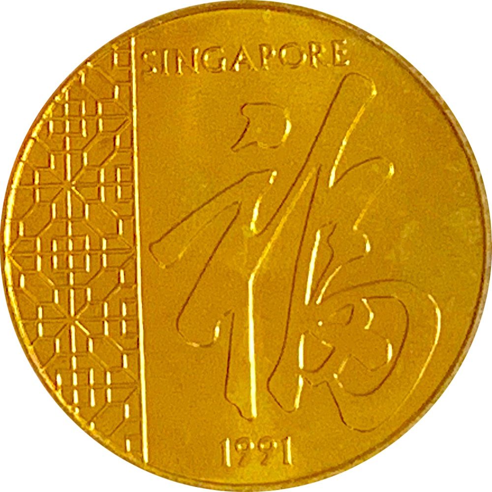 Опис: Стилізоване китайське мистецтво зліва, з написом SINGAPORE зверху, китайський ієрогліф (fu), що означає «щастя» або «благословення», в центрі. Рік випуску 1991 внизу.