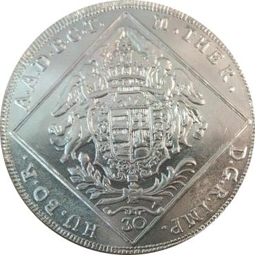Опис: Репліка монети Марії Терезії 1769 року номіналом 30 крейцерів з Угорщини. Два ангели тримають угорську корону та герб з цифрою 30, що означає номінал монети в 30 крейцерів.
