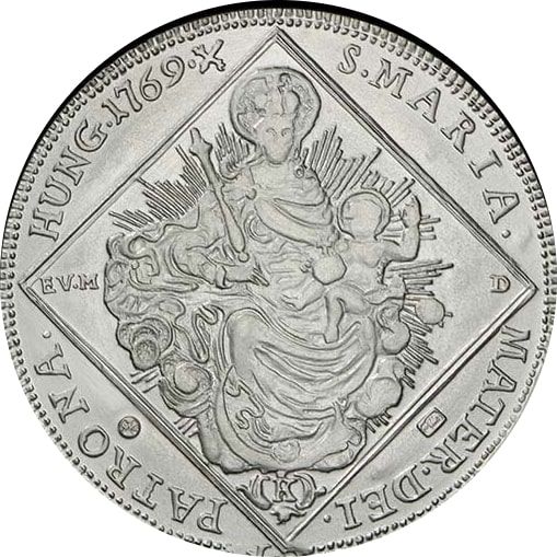 Опис: Репліка монети Марії Терезії номіналом 30 крейцерів 1769 року. На монеті зображена коронована і прославлена Мадонна, яка сидить, тримаючи дитину Христа на лівому руці.
