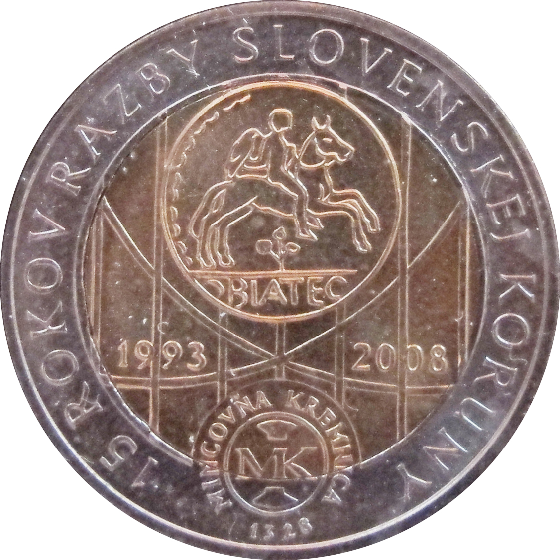 Опис: Напис на зовнішньому кільці. Логотип монетного двору Кремніца (напис на зовнішньому кільці, «MK» у центральній частині з двома половинами монетного преса над і під «MK») розташований у нижній частині монети, розділеної навпіл межею кільця. Внутрішнє кільце включає 7 вертикальних смуг з двома гіперболічними кривими, що перетинають середню смугу і симетричні відносно неї. Дві дати розміщені в лівому та правому сегментах, утворених кривими. У верхній частині внутрішнього кільця зображено монету Біатец (вершник на коні, що стрибає через гілку липи, яка росте з землі. Напис під рівнем землі. Півмісяць у формі фестонів прикрашає ліву сторону монети).