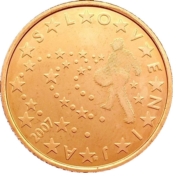 Опис: «Сівач», що сіє зірки, за мотивами словенського імпресіоніста Івана Грохара (1867–1911), оточений дванадцятьма зірками Європи, що чергуються з літерами слова «SLOVENIJA» (Словенія).