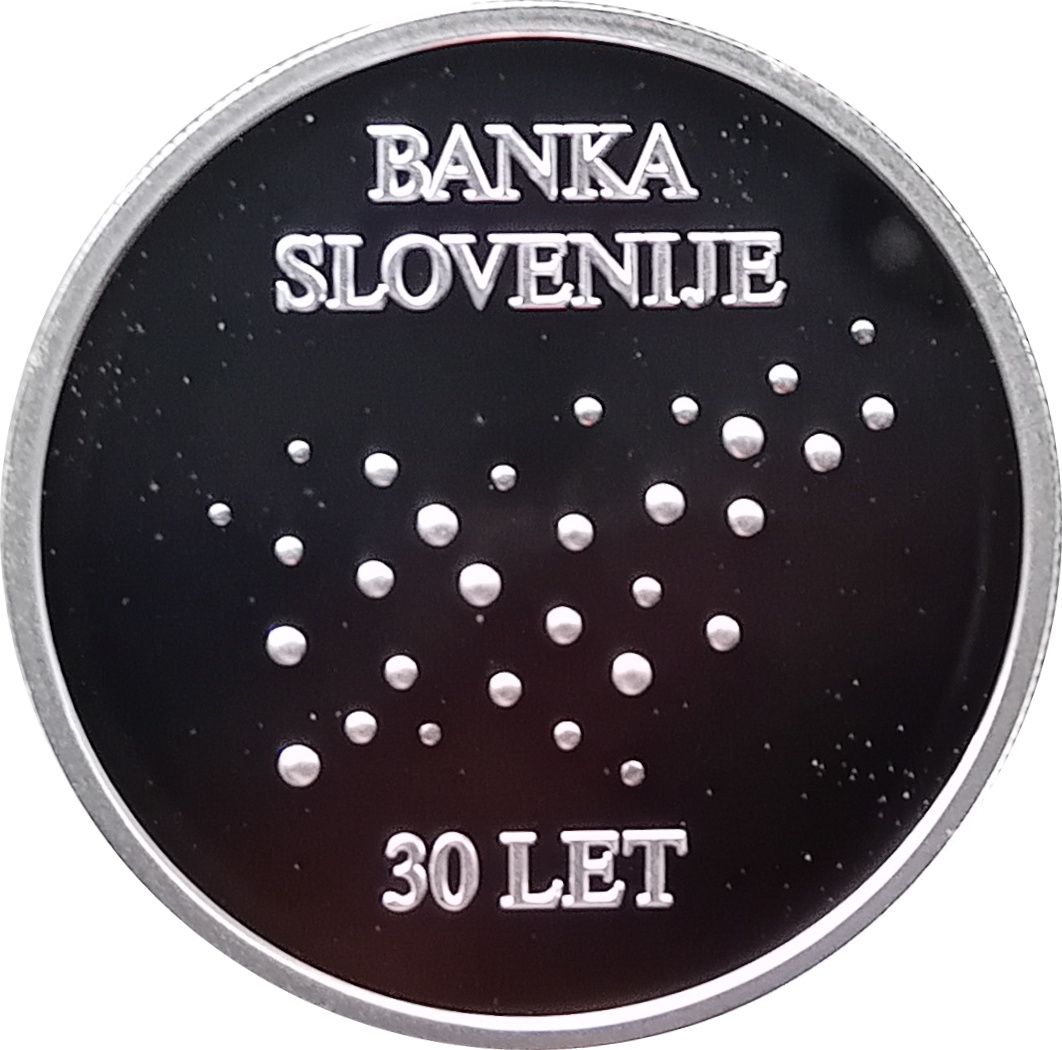 Опис: Крапки в сітці у формі карти Словенії, напис «BANKA SLOVENIJE» зверху та напис «30 LET» знизу. Розмір крапок, здається, відображає географічне розташування більших міст Словенії.