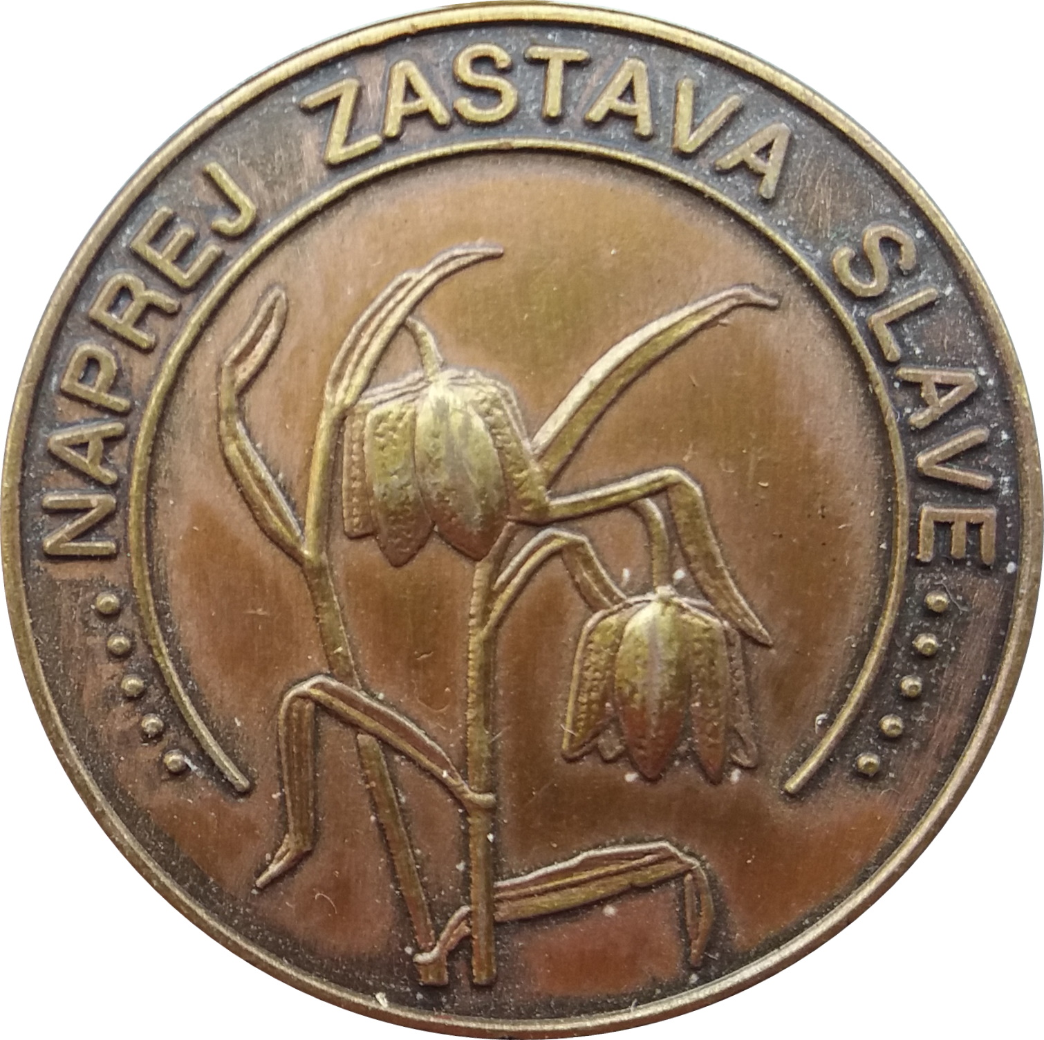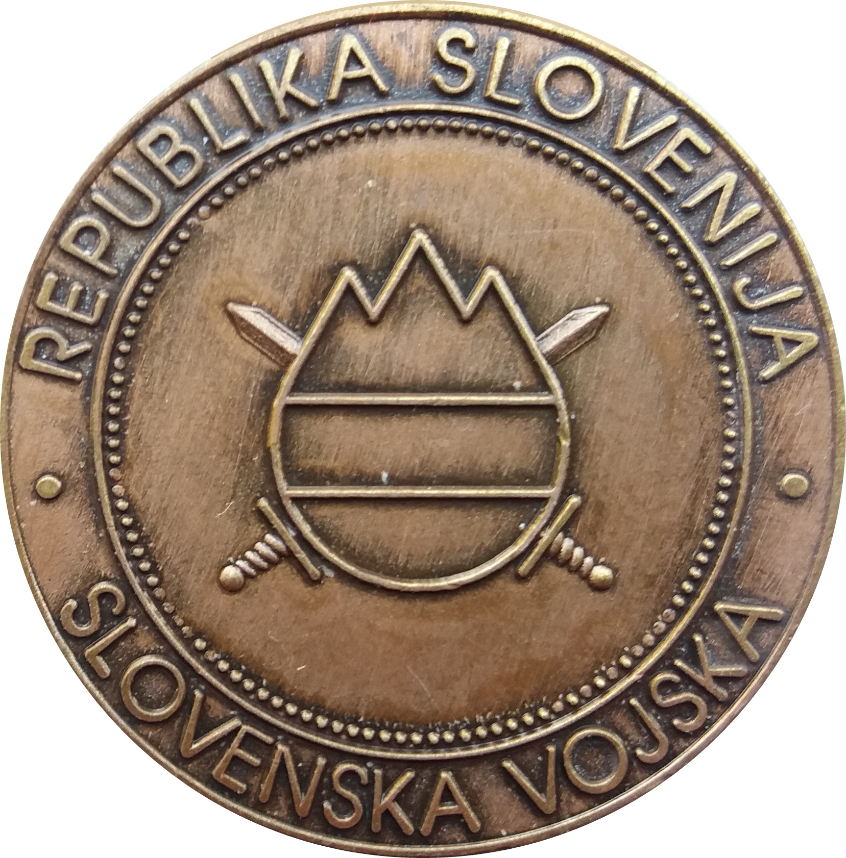 Опис: Два схрещені мечі за зображенням словенського прапора в колі з трьома вершинами над ним, які символізують Триглав — найвищу гору в Словенії.