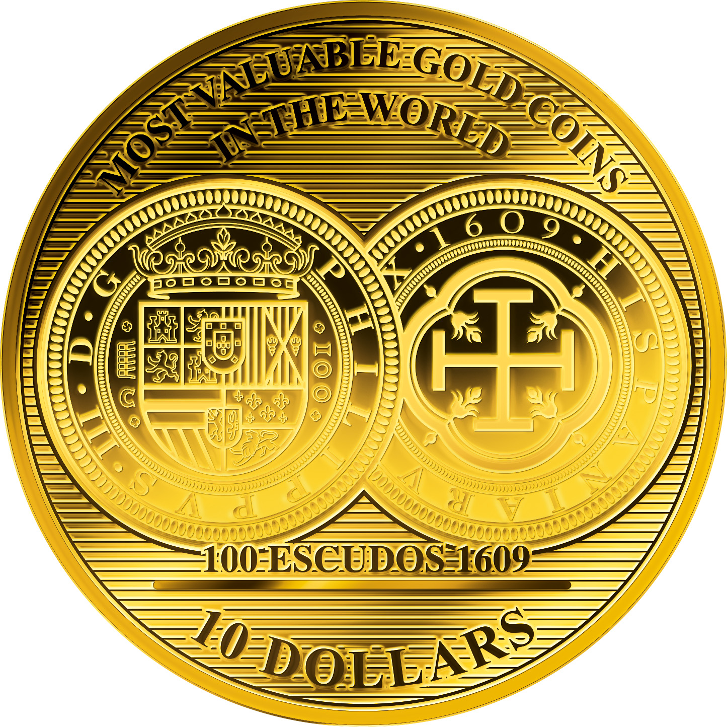 Опис: Іспанська 100 ескудо або Centen, випущена в 1609 році за правління Феліпе III.