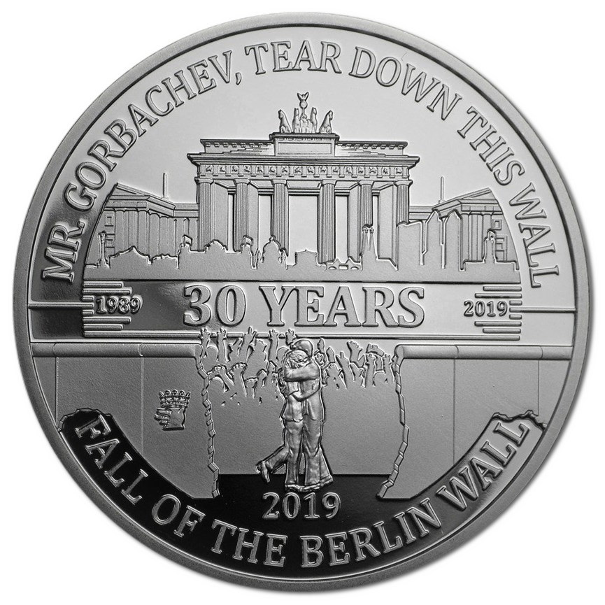 Опис: Знамениті Бранденбурзькі ворота та стилізований горизонт Берліна. У нижній половині монети зображено пару, що обіймається, а за ними — стіна, частина якої зруйнована. На одній стороні стіни — знак Берлінського державного монетного двору.