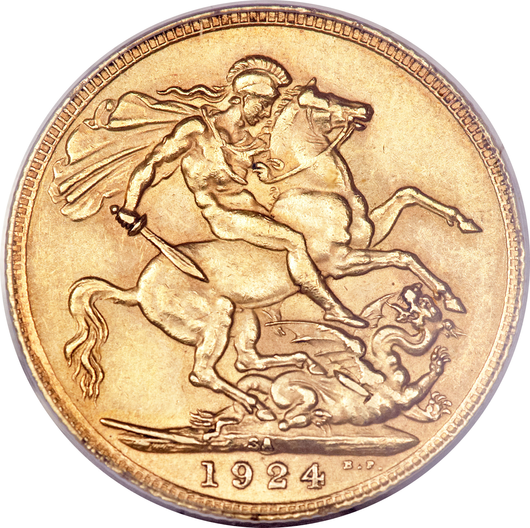 Опис: Святий Георгій, що вбиває дракона, праворуч, дата та ініціали гравера в екзергу, знак монетного двору під копитами коня.