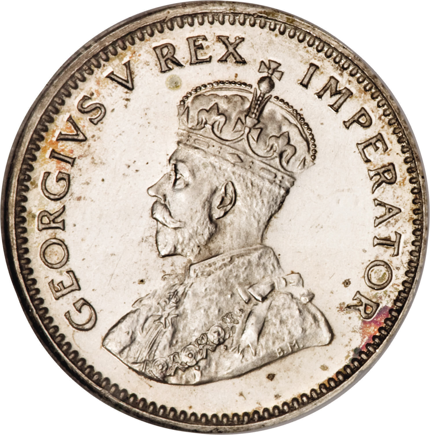 Опис: Коронований бюст короля Георга V ліворуч, напис навколо, ініціали гравера на зрізі.