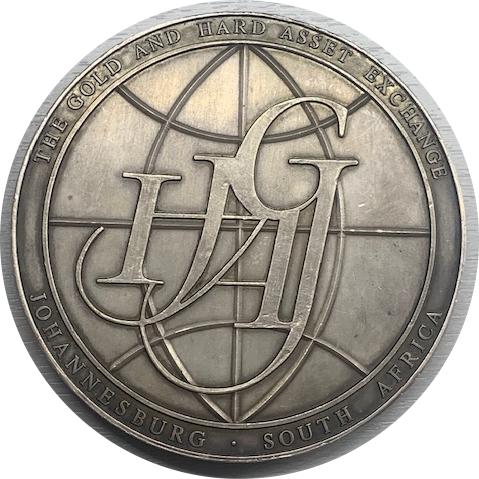 Опис: Логотип Gold and Hard Asset Exchange на тлі основних ліній широти та довготи світу. Напис навколо круглих країв медалі.
