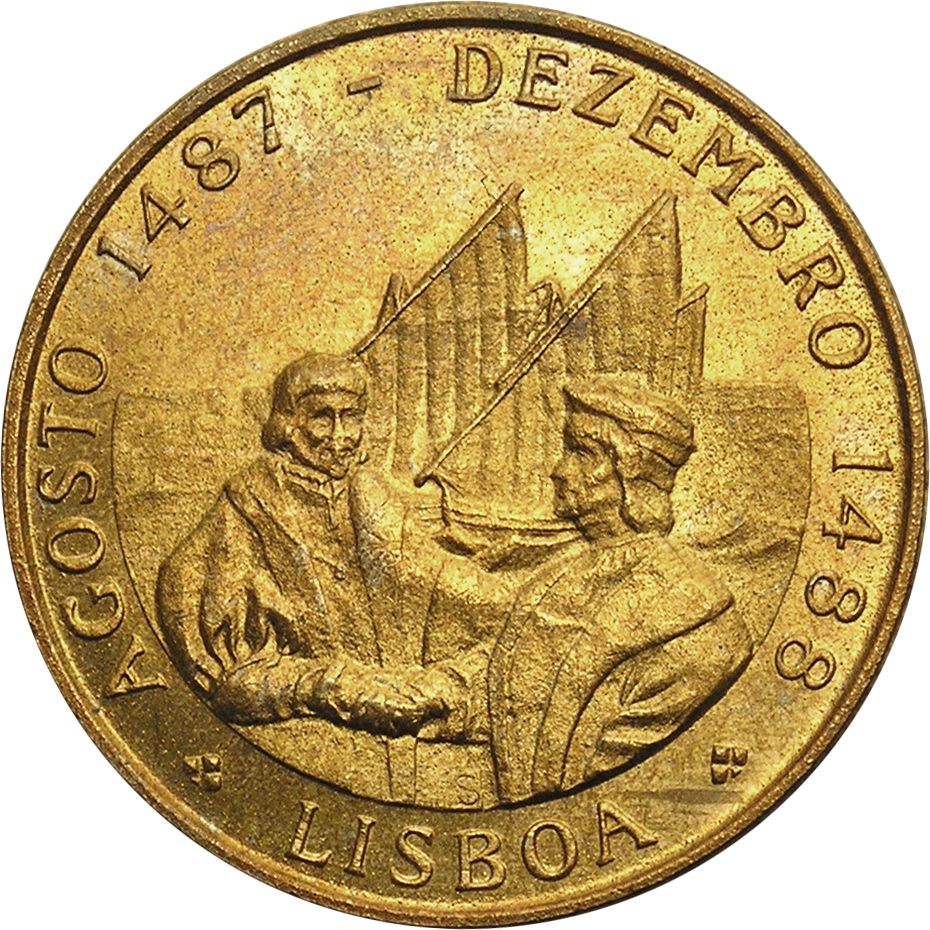 Опис: Зображення короля Португалії Жуана II, який бажає Бартоломеу Діашу успіхів у його подорожі, на тлі корабля Діаша «Сан-Крістовао».