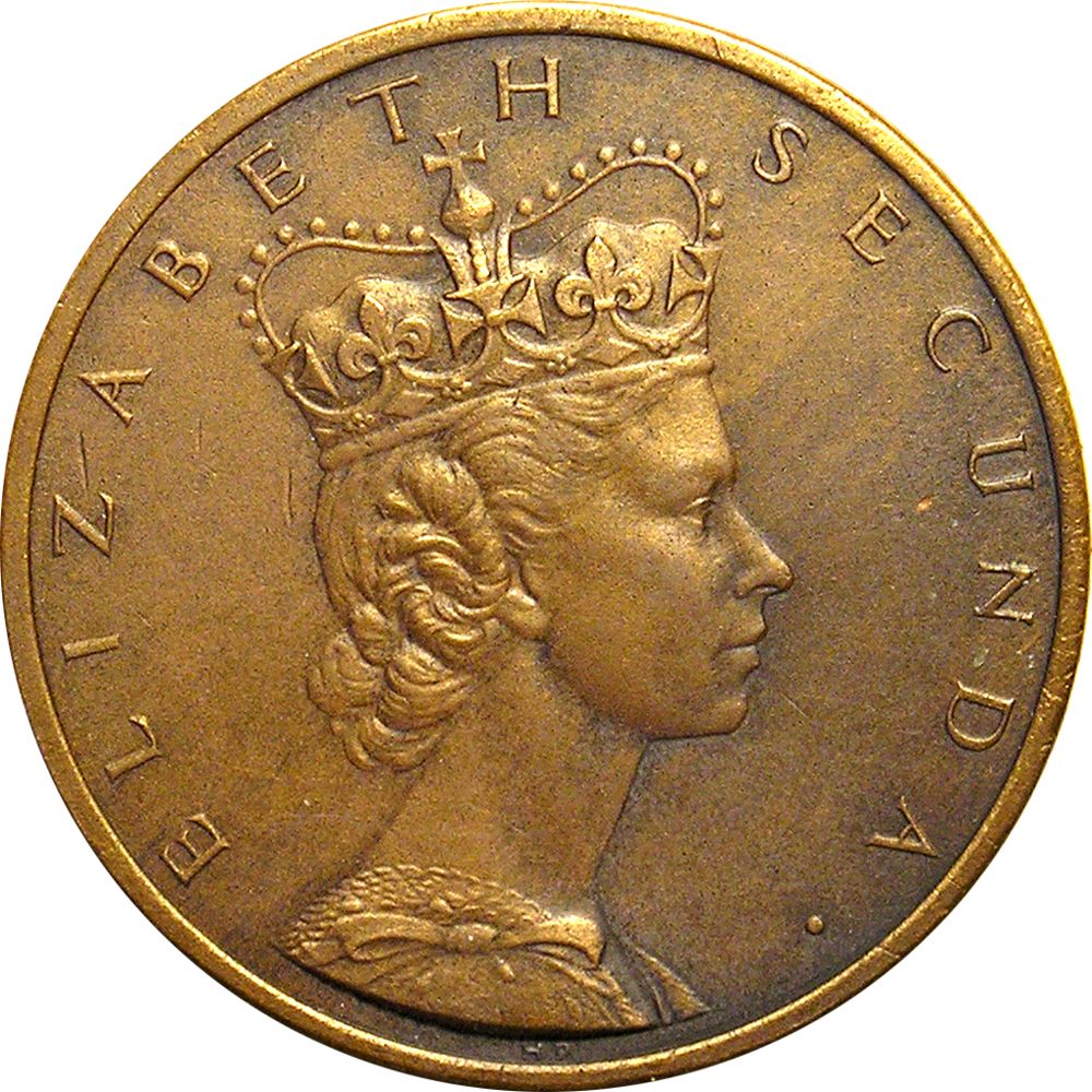 Опис: Молодий бюст королеви Єлизавети II в короні, звернений праворуч. Навколо — напис. Ініціали гравера під зрізанням.