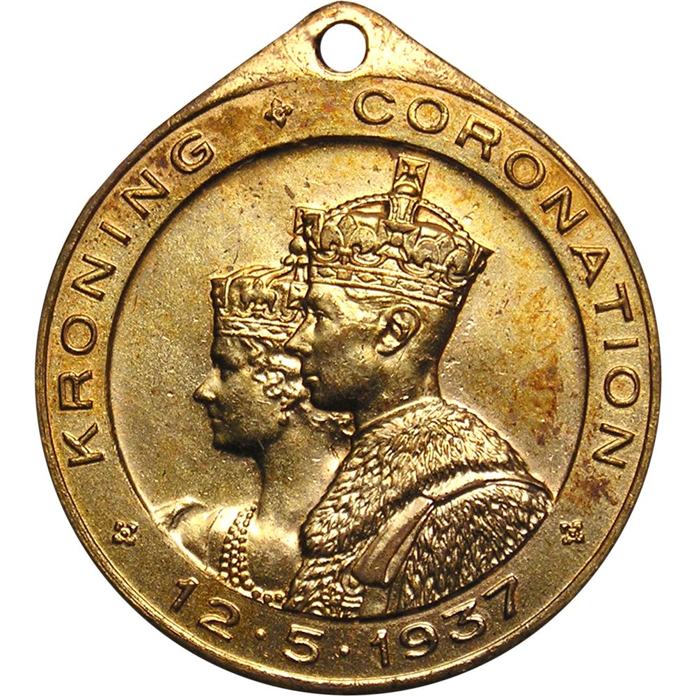 Опис: З'єднані короновані бюсти короля Георга VI та королеви Єлизавети, ліворуч. Напис на рельєфній смузі зверху: «KRONING (орнамент) CORONATION» (коронація), а знизу між орнаментами: «12 . 5. 1937».