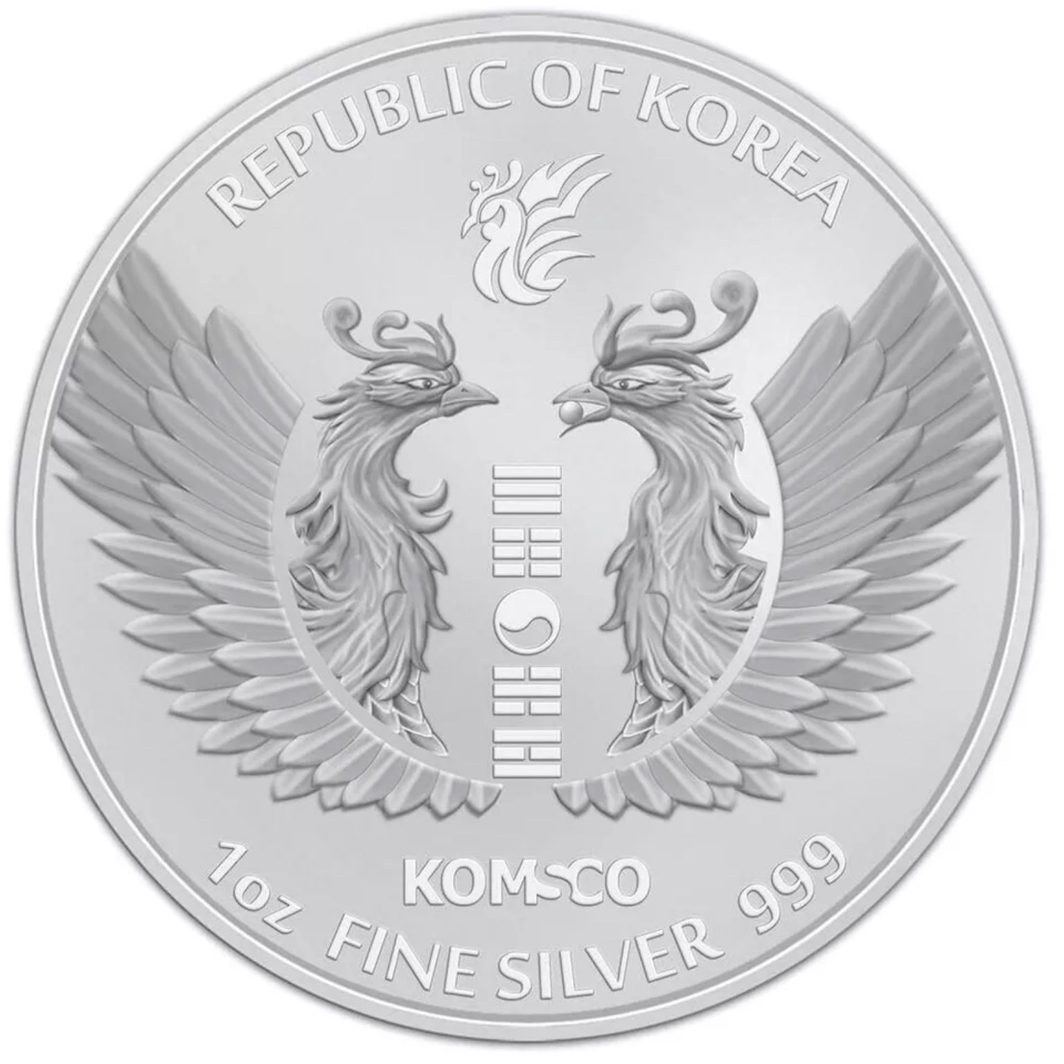 Опис: Птах фенікс у польоті з розпростертими крилами, витягнутими кігтями та вражаючими хвостовими пір'ям, що звисають внизу. Він тримає в дзьобі перлину (з народної казки «Яскрава перлина»). Існує також прихована захисна ознака, викарбувана безпосередньо на монеті праворуч від фенікса, яка змінюється, коли ви нахиляєте її під різними кутами, відкриваючи 한국 (що означає «Корея») та контури Корейського півострова.