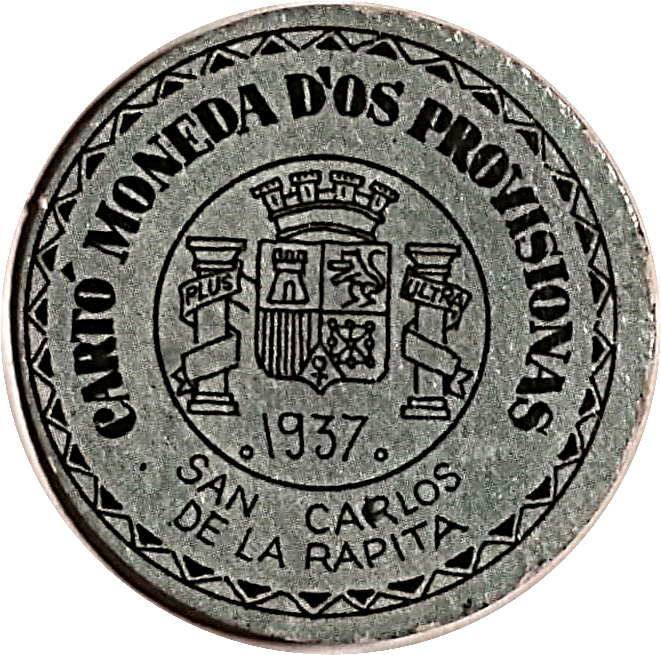 Опис: На зеленому тлі зображено два суцільних і суміжних кола, перше з яких прикрашене, а друге — чорне і тонке. Між обома колами розміщено написи: CARTÓ MONEDA D'OS PROVISIONAS (зверху); SAN CARLOS DE LA RAPITA (знизу). У центрі зображено зображення, дуже схоже на герб Другої Іспанської Республіки, повністю чорного кольору. Під щитом розміщено дату 1937 рік.