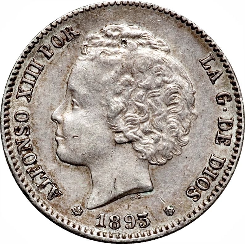 1 песета — Альфонсо XIII (2-й портрет) 1893 – 1894 Іспанія