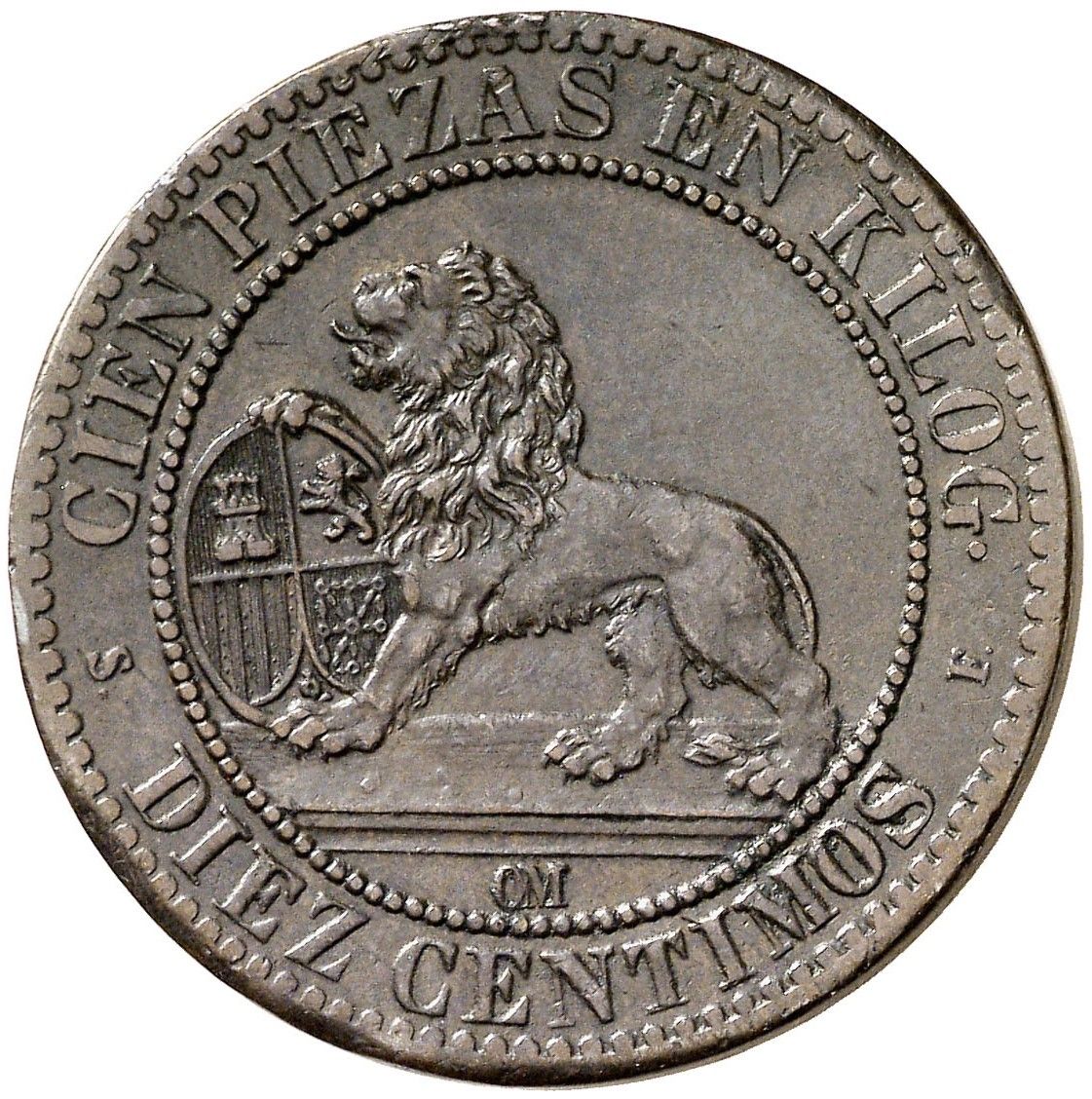 Опис: Лев, що дивиться вліво, йде, права передня лапа спирається на овальний герб Іспанії, всередині круга з намистинами.