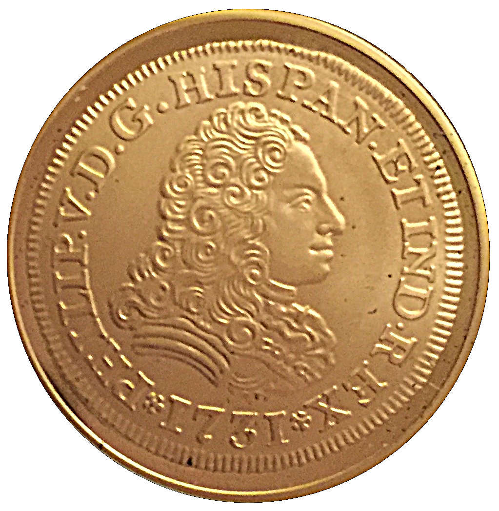 Опис: У колі, центром якого є монета, на звороті монети номіналом 2 ескудо або «Доблон» Феліпе V, викарбуваної на Мадридському монетному дворі в 1731 році (KM# 352), зображено королівський герб Кастилії та Леону, з Гранадою в центрі та ліліями Бурбонської династії.