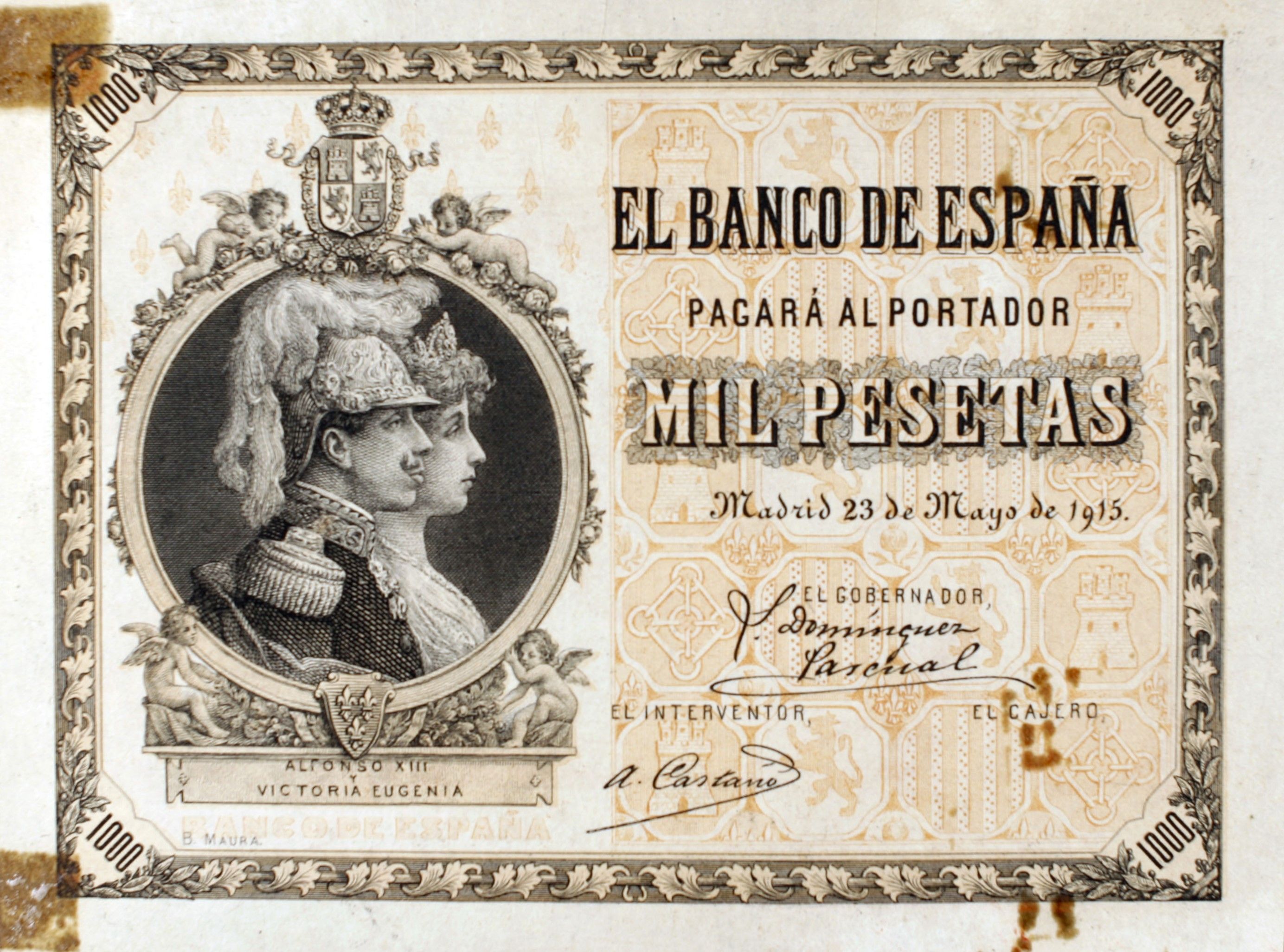 Опис: Чорний і сірий друк; підкладка кольору охри. Погруддя короля Альфонсо XIII і королеви Вікторії Євгенії в круглому медальйоні, по боках якого зображені крилаті херувими, а зверху — герб Іспанії, на тлі герба Королівства Іспанії праворуч. Геометричні візерунки.