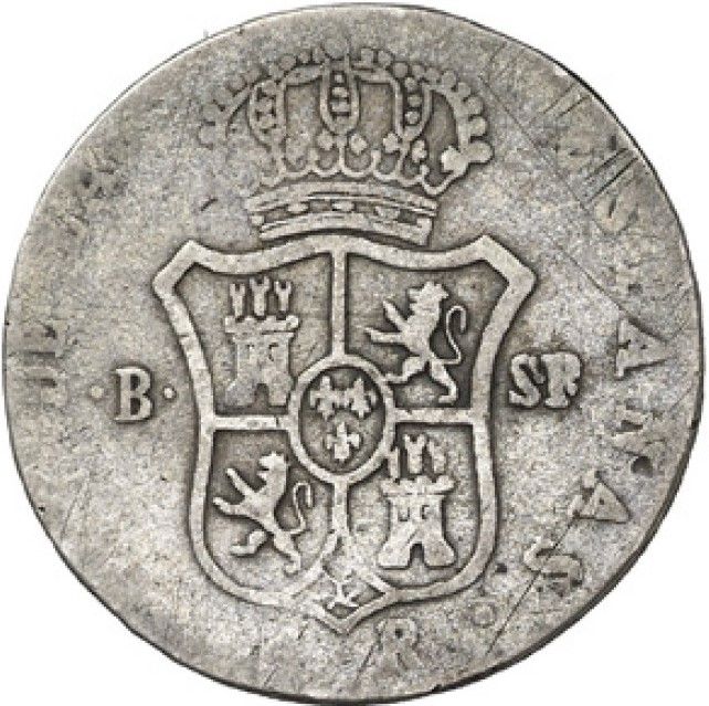 Назва: 2 реалес — Фердинанд VII (драпірований бюст; REY DE LAS ESPAÑAS)
