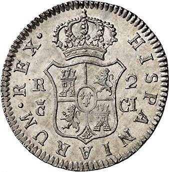 Назва: 2 реалеса — Фердинанд VII (бюст у лавровому вінку)