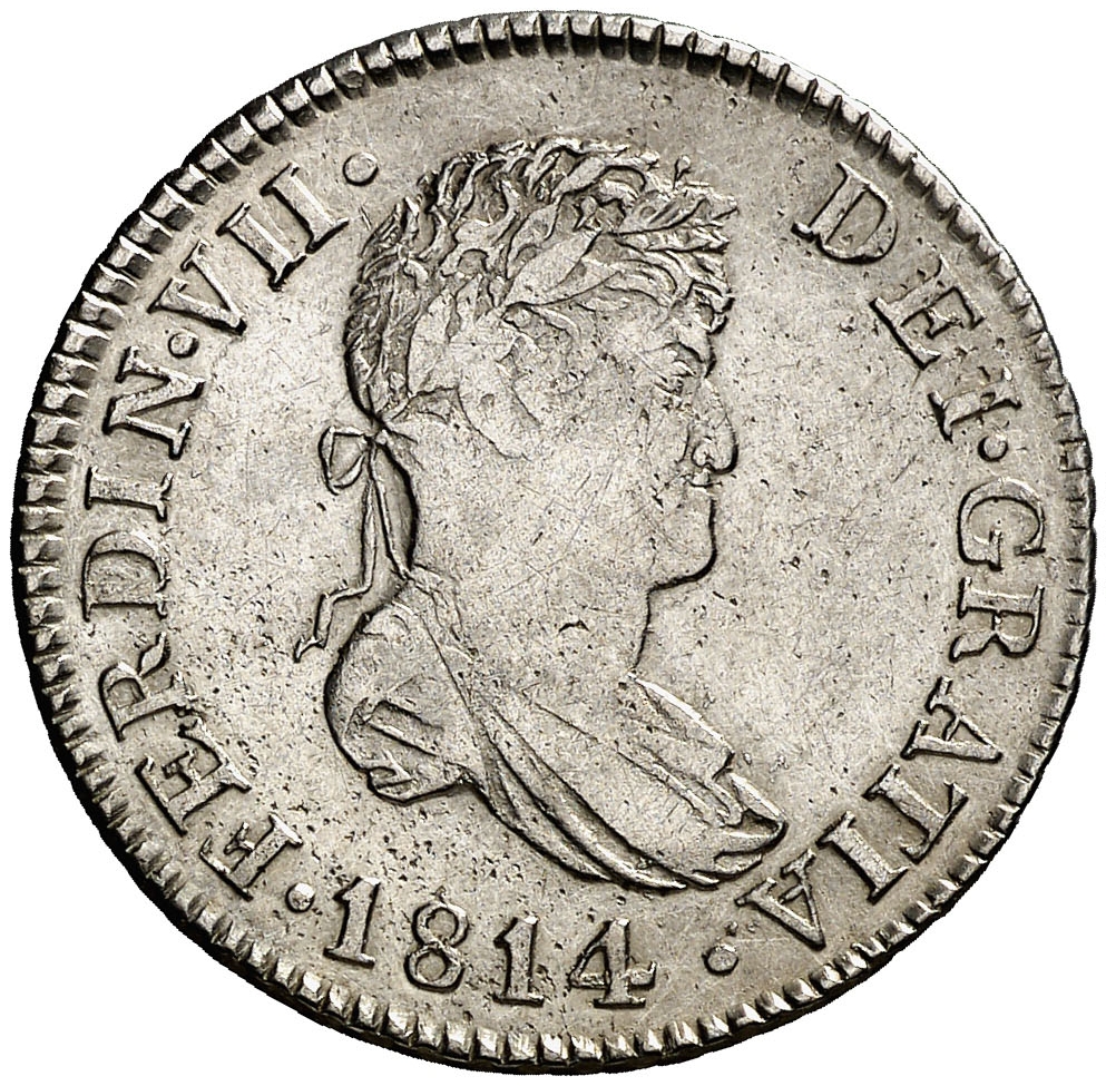 2 реалеса — Фердинанд VII (подорожуючий; бюст у лавровому вінку) 1812 – 1814 Іспанія