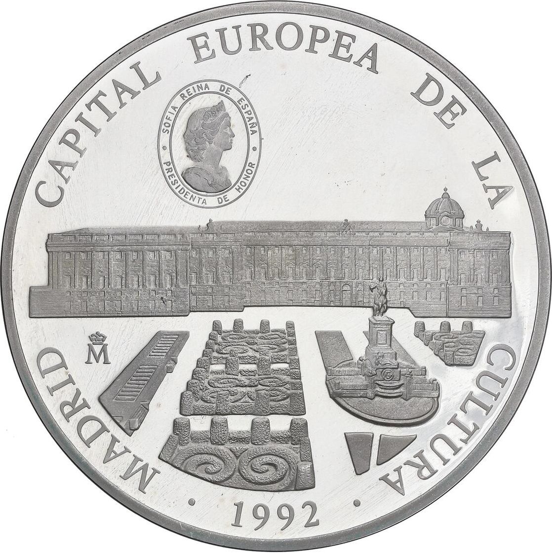 Опис: Овальна монета із зображенням Софії, що дивиться вправо над Королівським палацом і садами в Мадриді.