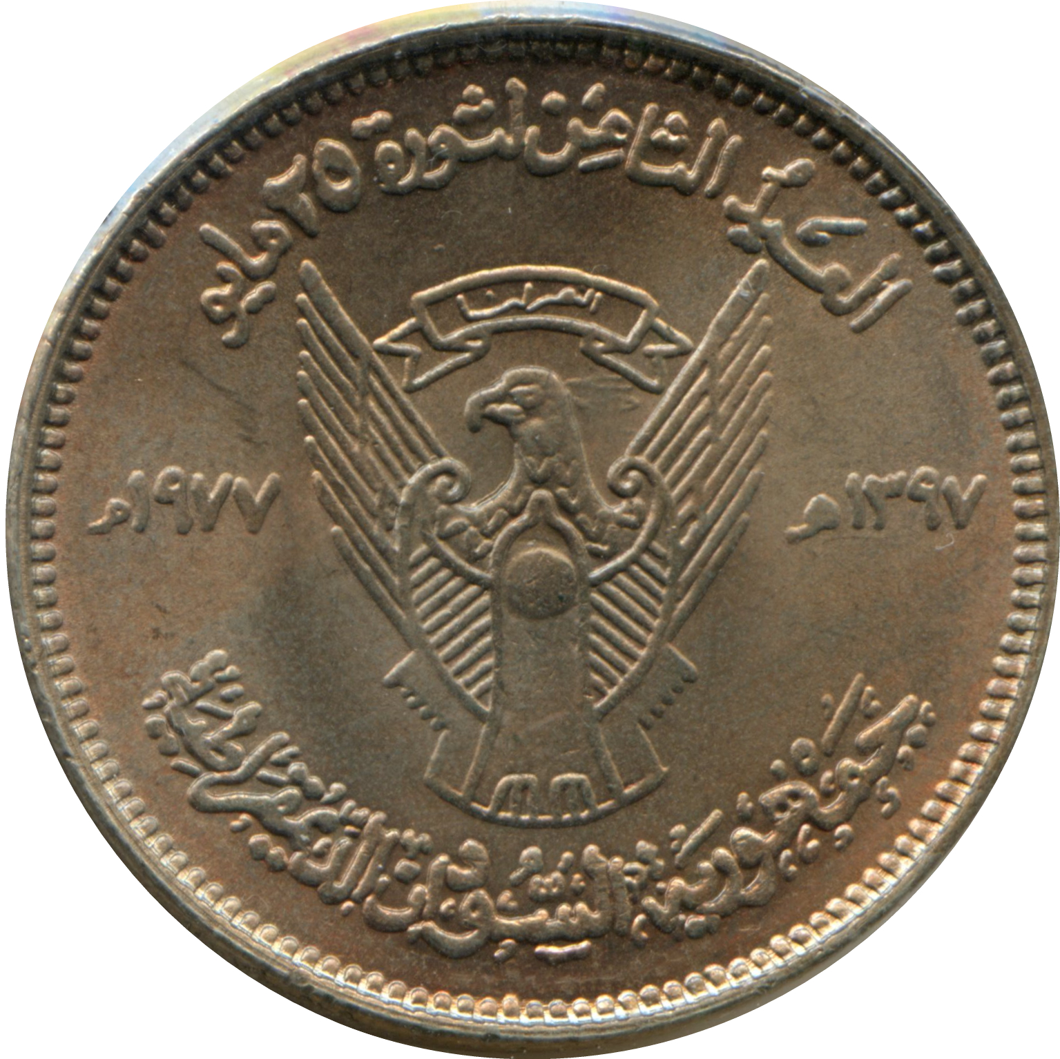 Опис: Зображено державний герб Демократичної Республіки Судан (1970–1985) з розділенням дат за григоріанським (ліворуч) та ісламським (праворуч) календарями арабськими цифрами. Над гербом розміщено напис «Восьма революція 25 травня», а під ним — назва країни.
