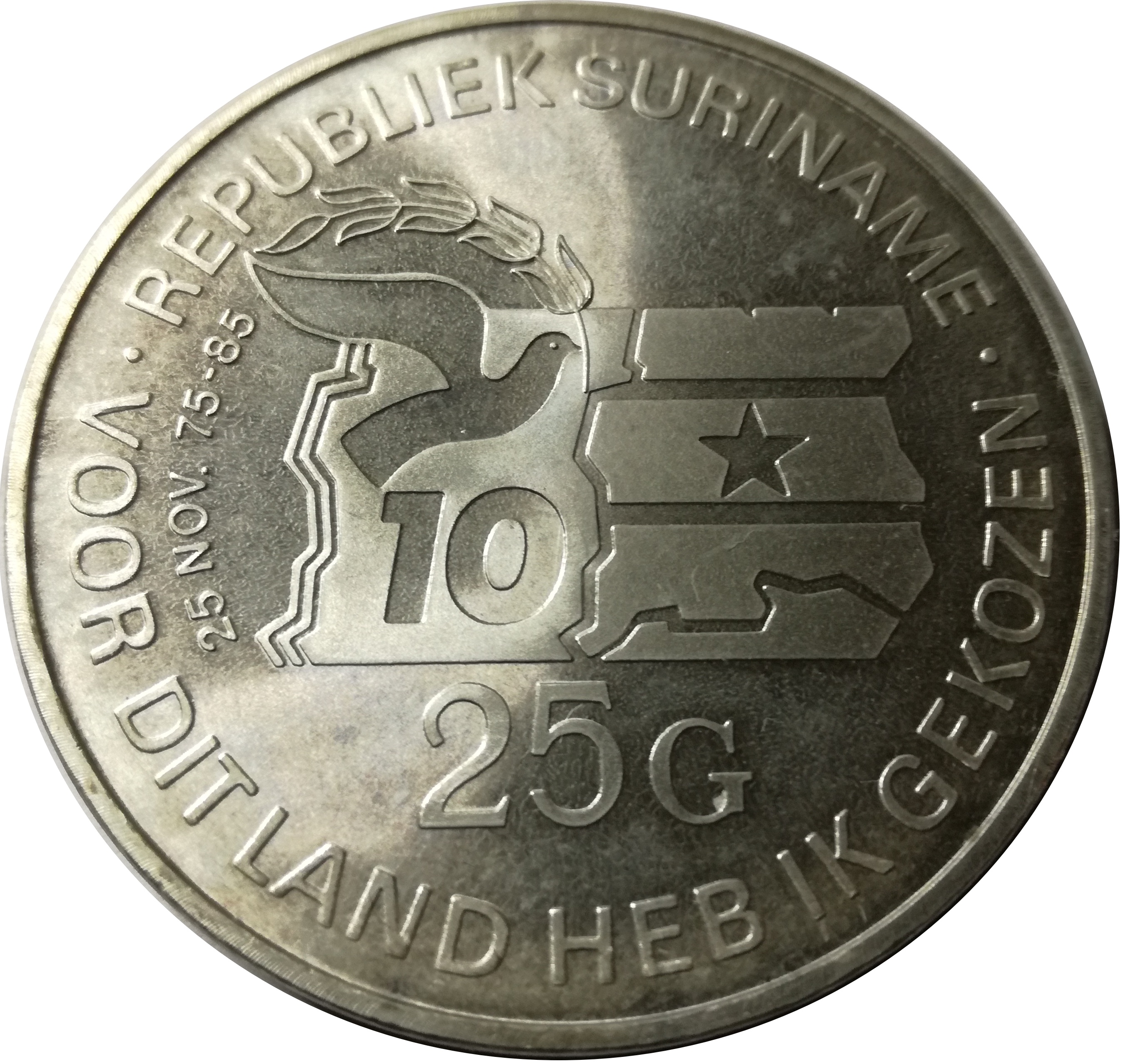 Опис: Голуб миру з гілкою перед прапором Сурінаму над номіналом. Під голубом цифра 10 (роки незалежності). Текст навколо всього зображення.