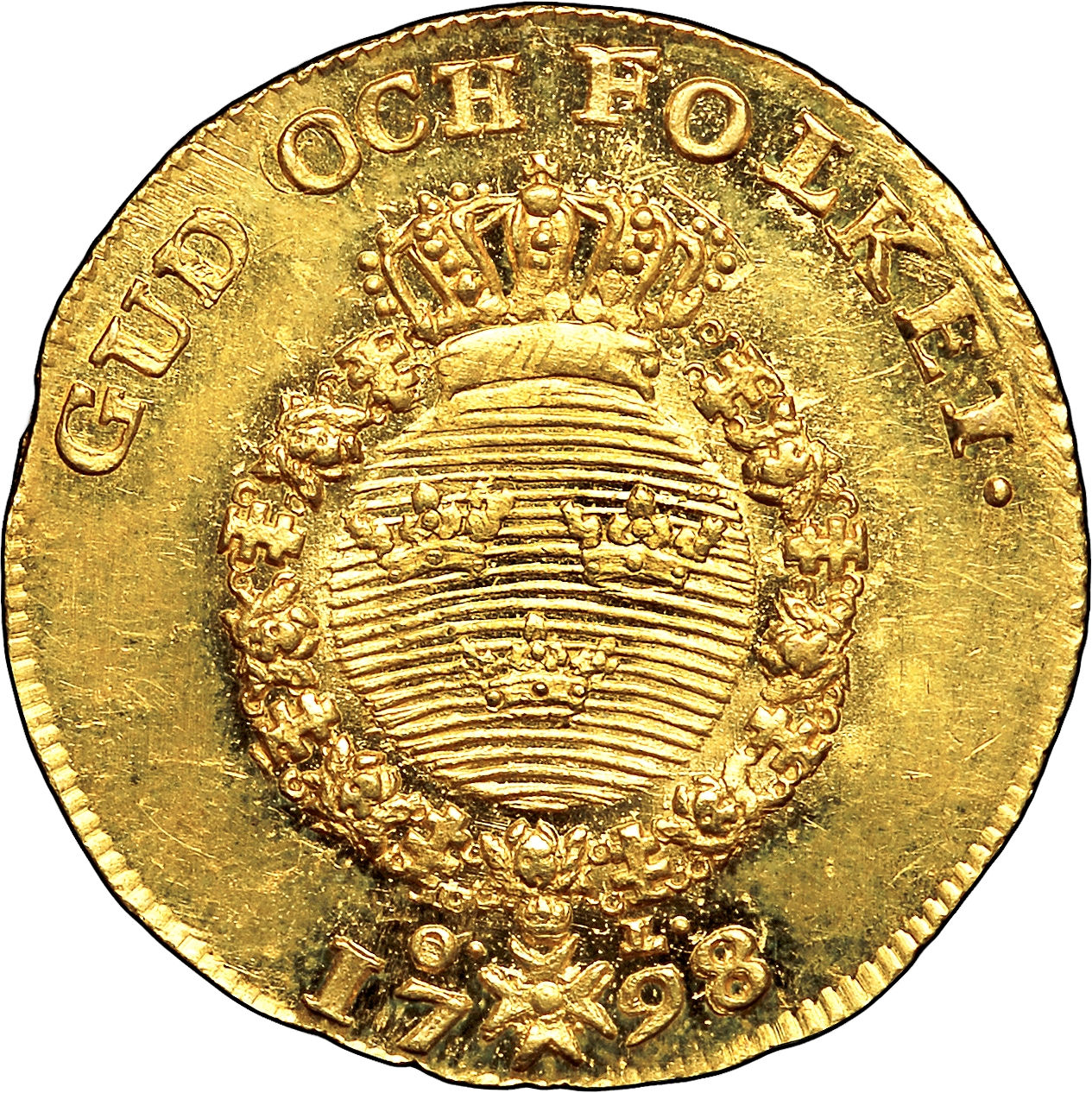 Опис: Коронована лінія з трьома коронами Швеції в ланцюзі Ордена Серафимів. Ланцюг розділяє дату та знак монетного двору нижче. Над короною розміщено девіз короля.