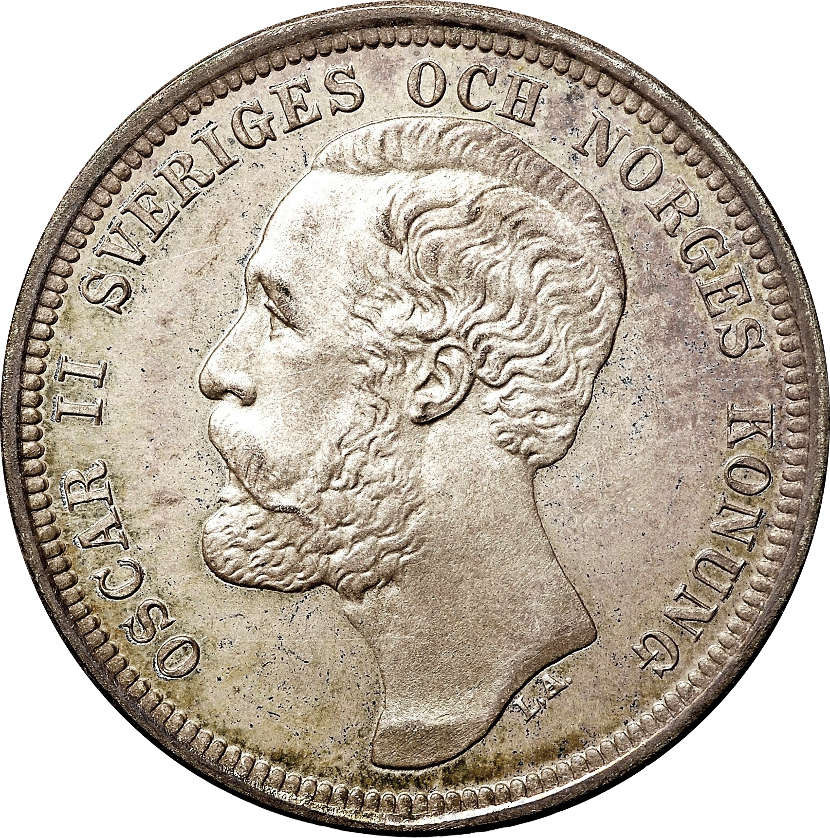 Опис: Голова короля Оскара II, звернена вліво, з ініціалами гравера під шиєю. Напис по краю.