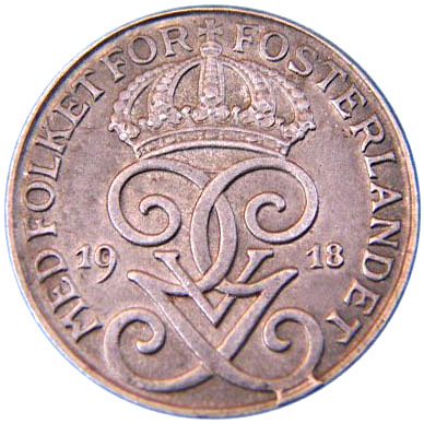 Опис: Коронований подвійний монограм короля Густава V Швеції розділяє дату. Девіз короля навколо обідка.