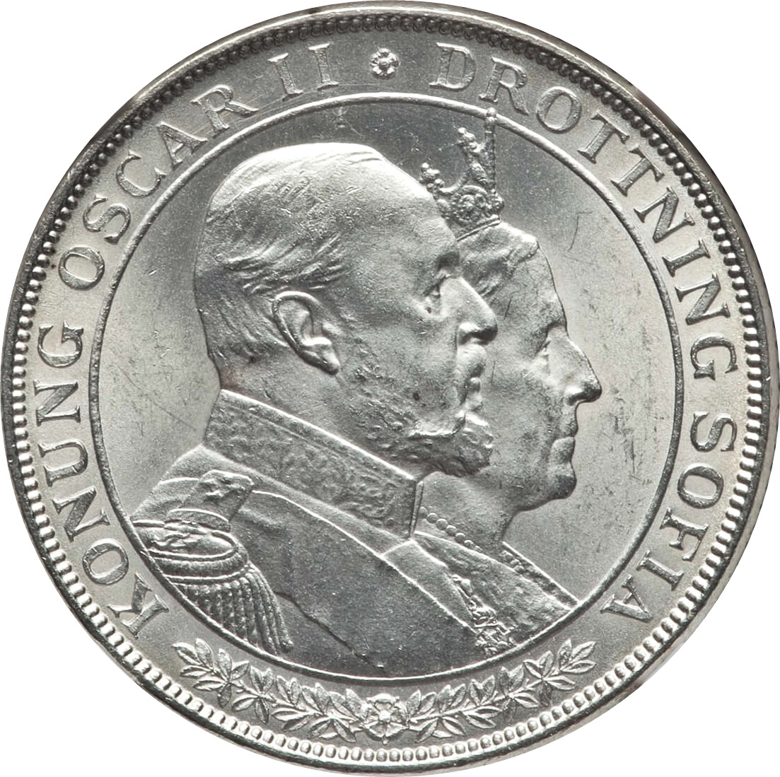Опис: З'єднані бюсти короля Оскара II та королеви Софії, звернені вправо, у колі. Зовні — імена королівського подружжя та квітковий орнамент знизу.