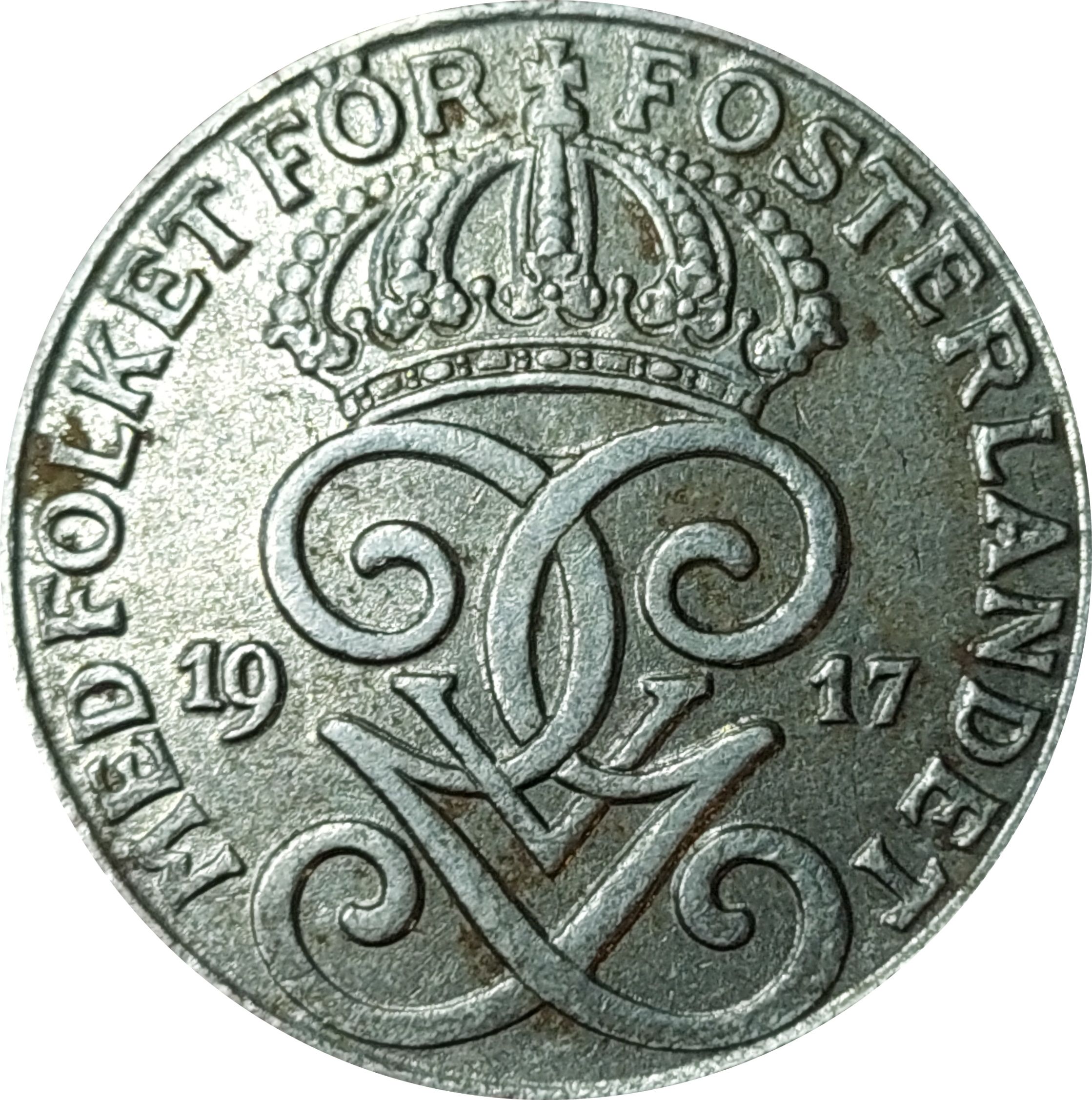 Опис: Коронований подвійний монограм короля Густава V Швеції розділяє дату. Девіз короля навколо обідка.