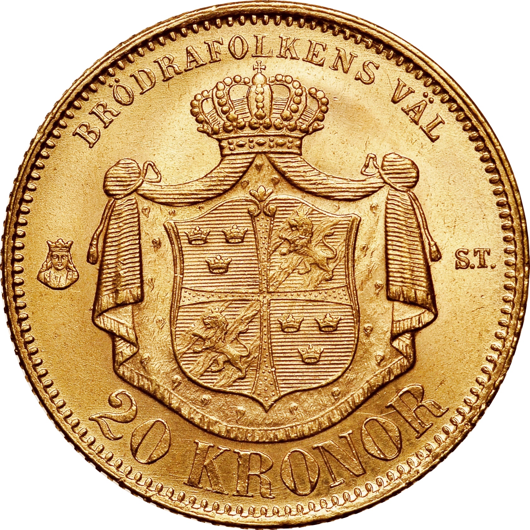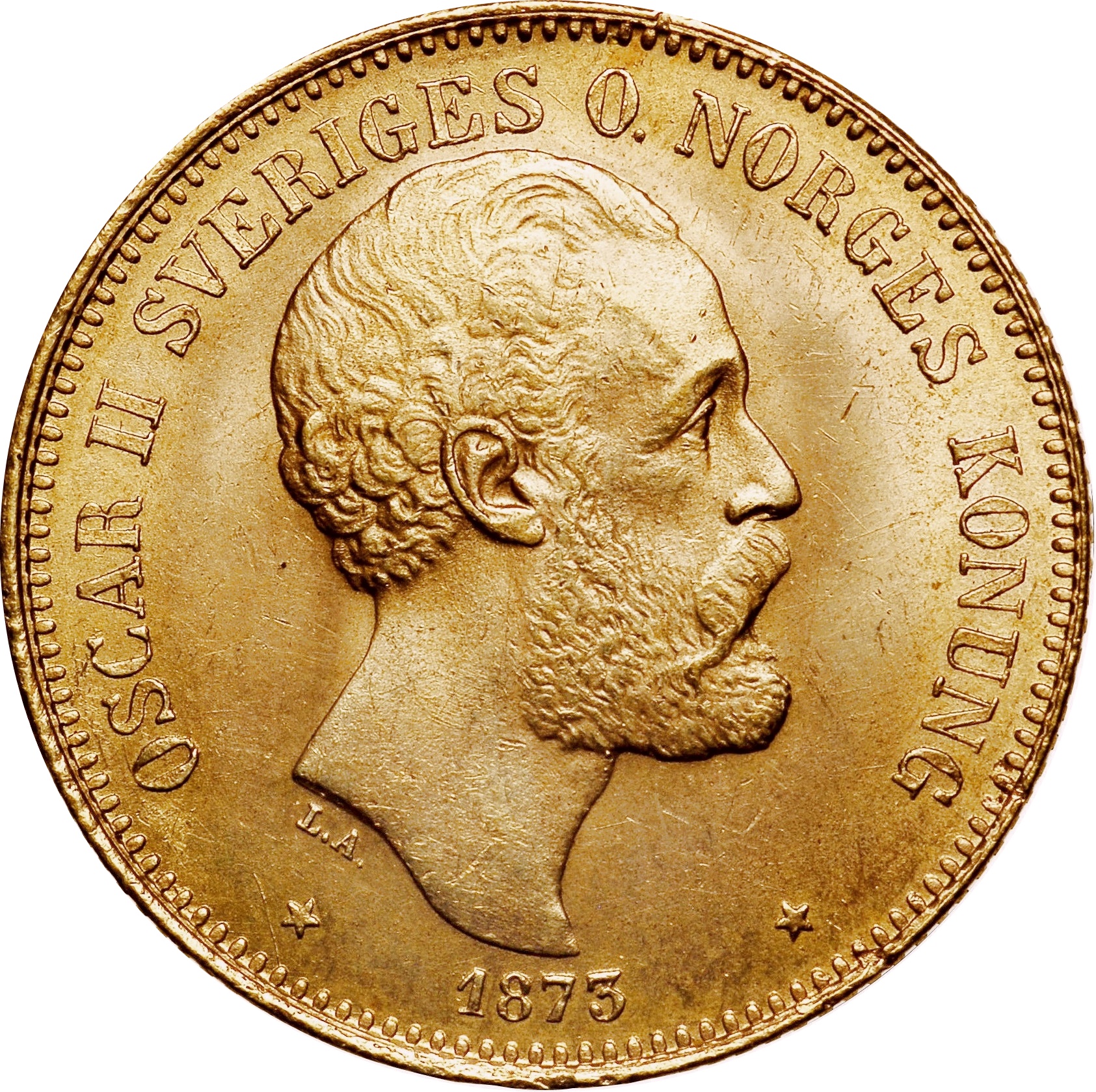 20 крон — Оскар II («О» у назві; без середнього щита) 1873 – 1876 Швеція