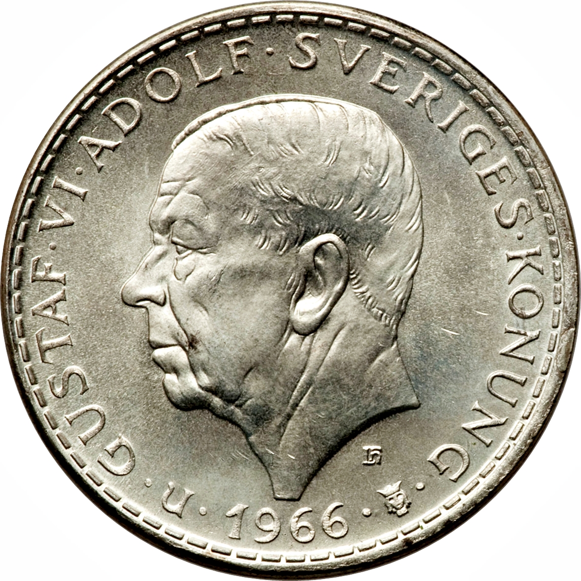 Опис: Портрет короля Густава VI Адольфа, зверненого вліво. Навколо – напис. Нижче дати зліва – перша літера прізвища голови Ріксбанку, а праворуч – знак монетного двору. Монограма гравера під обрізом.