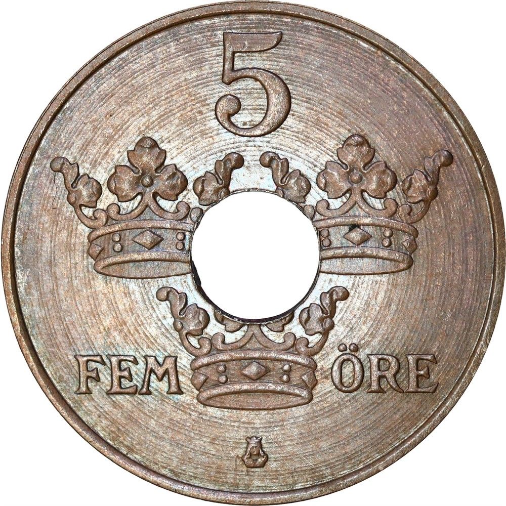 5 ер — Густав V (бронзовий зразок; з отвором) 1919 – 1920 Швеція
